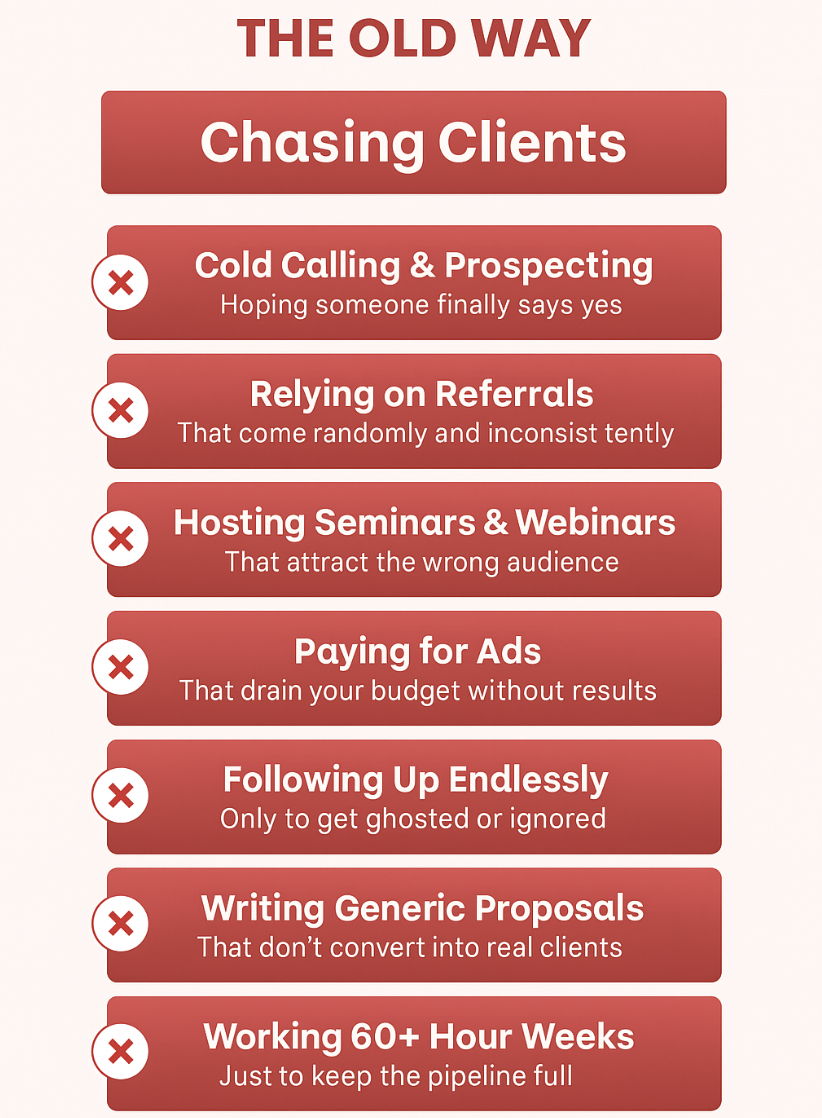 Most systems teach you to chase clients — cold call, network endlessly, or waste money on ads that never convert.