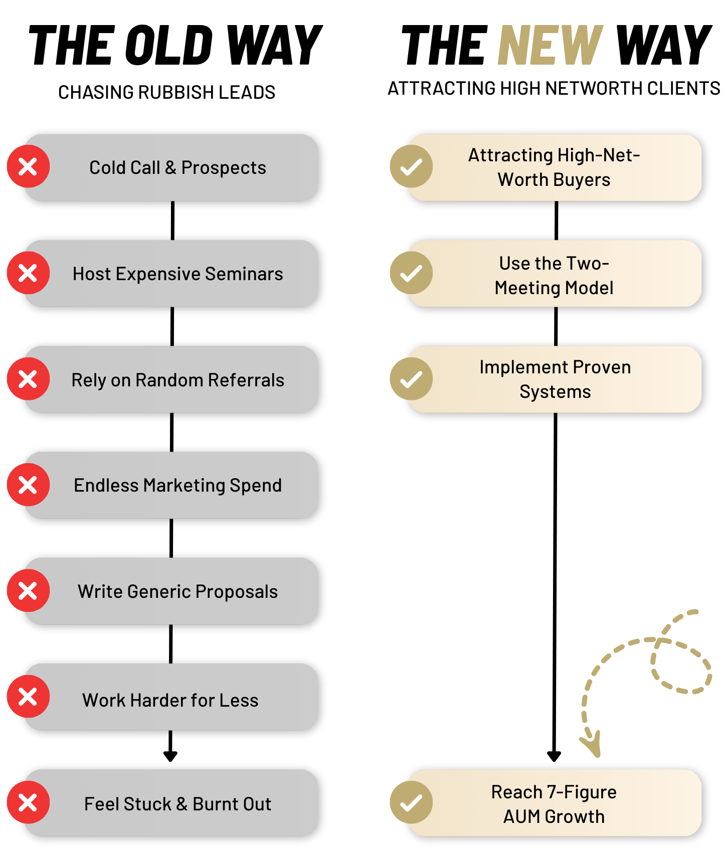 Whereas The AUM Accelerator Method™ gives you a clear, repeatable system that attracts qualified leads, converts them in two meetings, and builds long-term relationships that naturally generate referrals.
